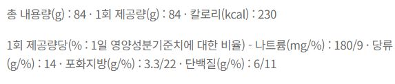 단백질은 6g에 나트륨은 180mg으로 낮은 수준이나, 당류가 14g으로 높은 수준이다.